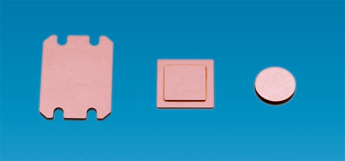 These materials, with their properties of low thermal expansivity (compared to Cu) and high heat conductivity (compared to 36NI-Fe and Fe) have been developed using our own composite technology. They can be easily pressed into shapes as shown below, and can also be brazed or soldered. These materials are ideally suited for use in heat-dispersion substrates, such as for LEDs and laser diodes.